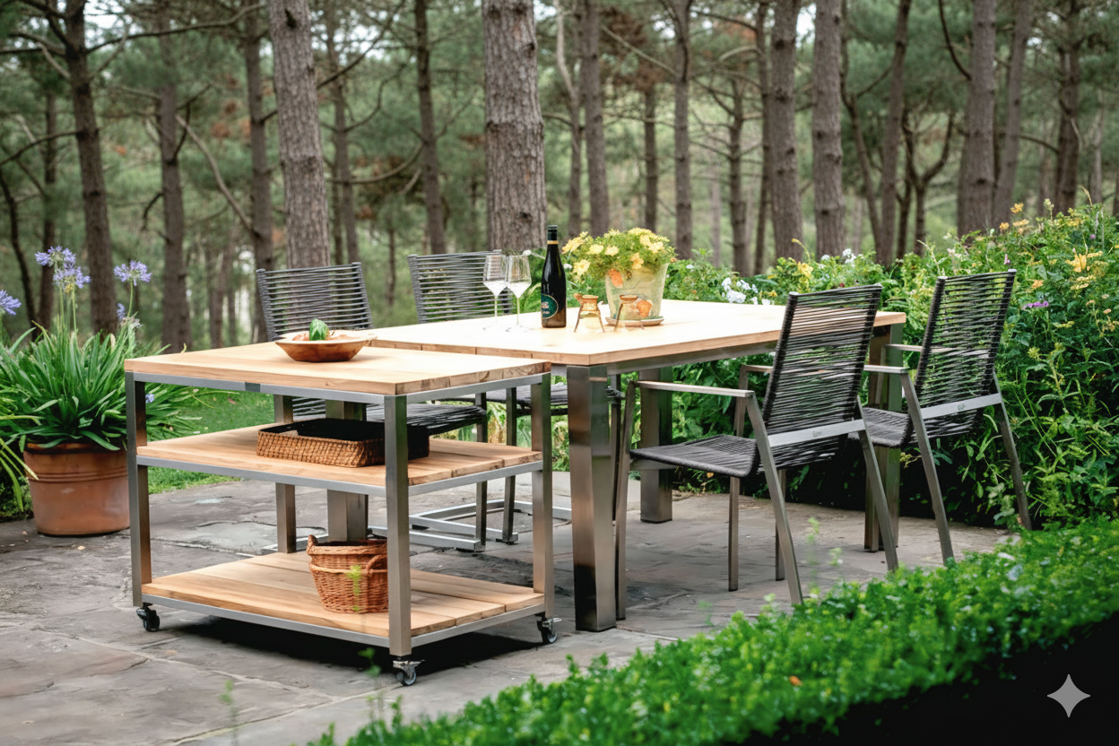 Set meja dan kursi outdoor yang dirancang khusus untuk balkon atau ruang luar berukuran kecil.