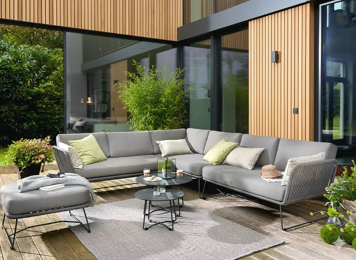 Sofa outdoor berbentuk sudut yang memberikan kapasitas duduk lebih luas dan tampilan rapi untuk area patio atau deck.