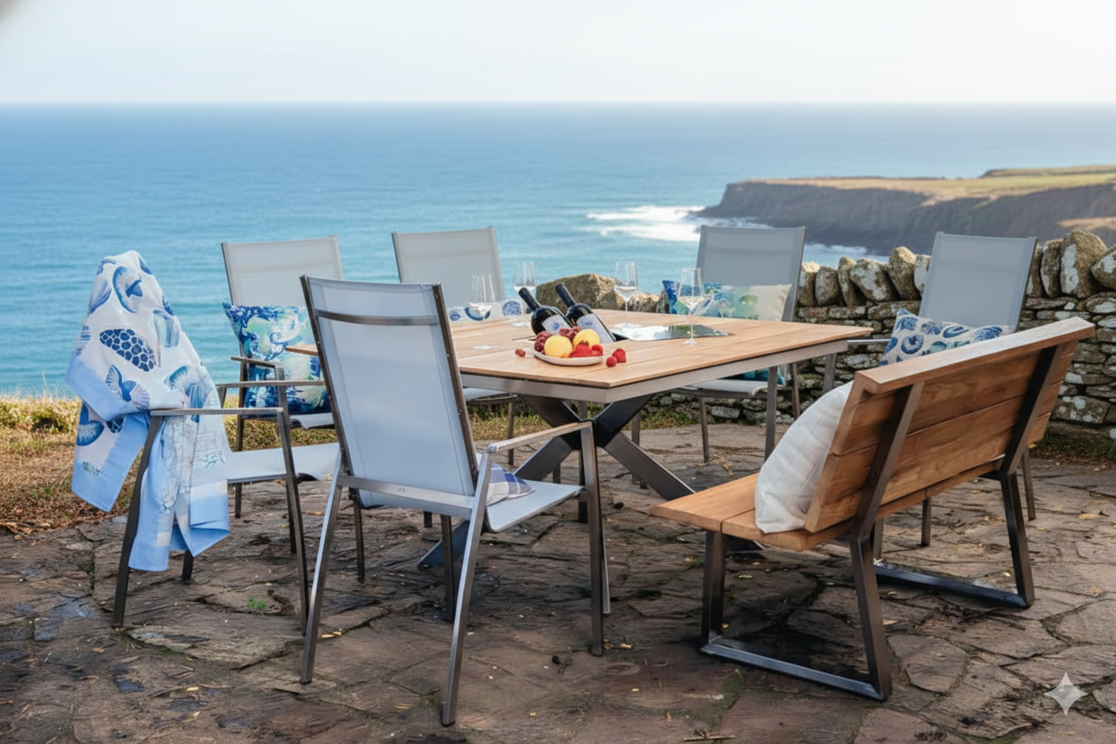 Kursi makan outdoor yang nyaman dan dirancang untuk melengkapi meja makan di area luar ruangan.