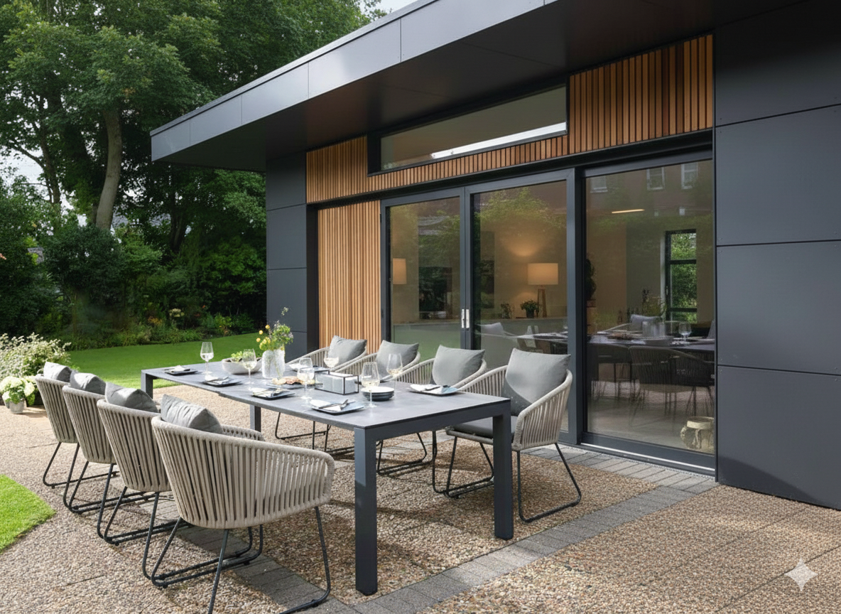 Meja makan outdoor dengan desain sederhana dan permukaan luas untuk berbagai kebutuhan aktivitas luar ruangan.