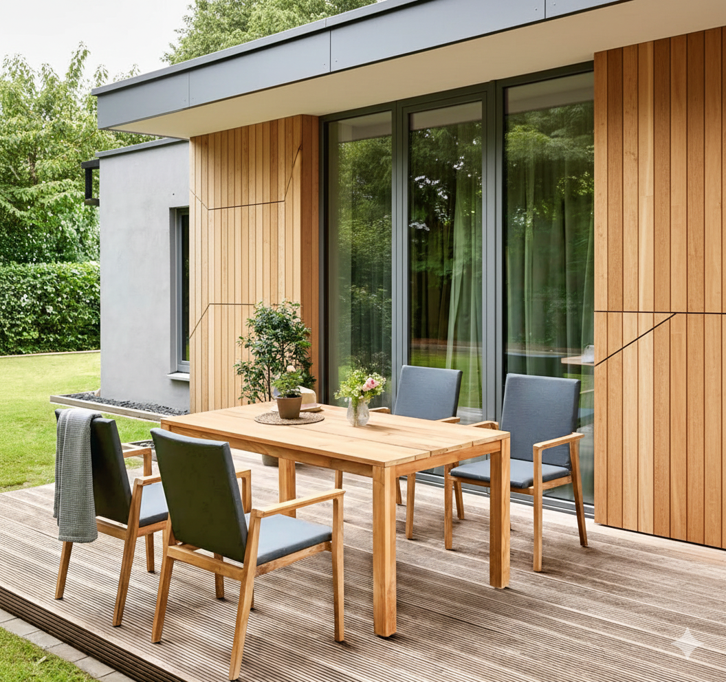 Set furnitur outdoor untuk bersantai yang menghadirkan suasana nyaman dan fungsional di taman atau teras.
